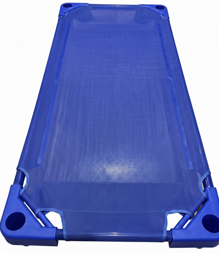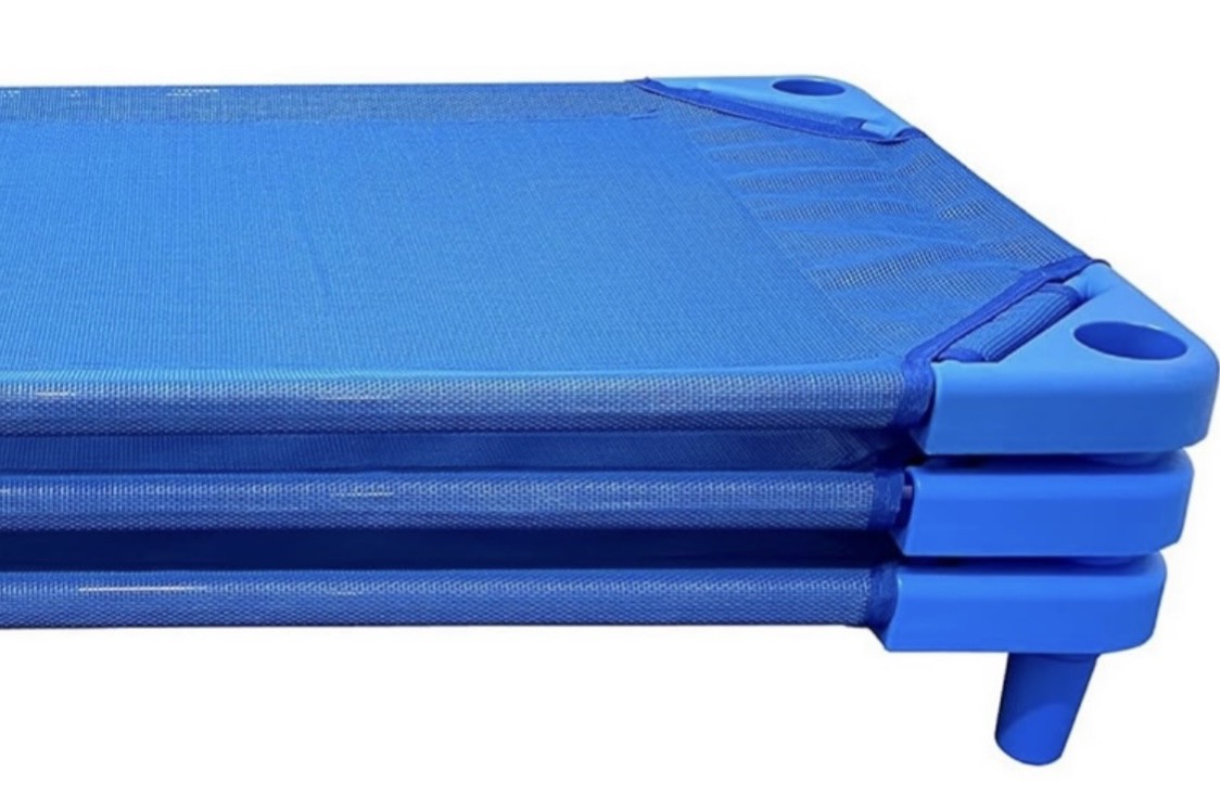 お昼寝コットは、保育園などで使われるメッシュ素材の簡易ベッドで、床から離れていて通気性が良く衛生的、布団に比べてホコリやダニの影響を受けにくく、保護者の準備・片付けの負担も減るため、近年導入が進んでいます。
